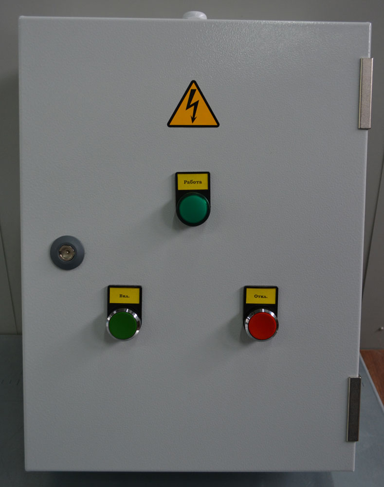 Щит комплектуется на вводе - автоматическим выключателем, на отходящих линиях предусмотрен контактор с тепловым реле. Кнопки пуск и стоп, переключатель режима управления и световая сигнализация расположены на двери.