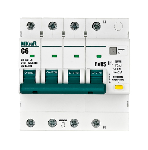 • DEKraft ДИФ-103 Дифавтомат 3P+N 6А 30мА AC (C) 6кА