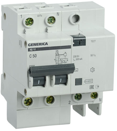 • Дифференциальный автомат 2Р 50A (С) 4,5kA тип AC 300mA IEK GENERICA АД12