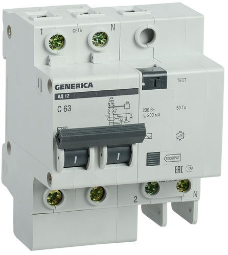 Дифференциальный автомат 2Р 63A (С) 4,5kA тип AC 100mA IEK GENERICA АД12 MAD15-2-063-C-100