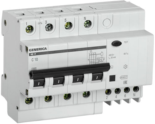 Дифференциальный автомат 4Р 10A (С) 4,5kA тип AC 30mA IEK GENERICA АД14 MAD15-4-010-C-030