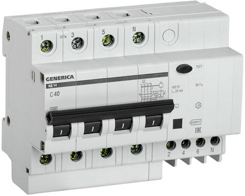 • Дифференциальный автомат 4Р 63A (С) 4,5kA тип AC 30mA IEK GENERICA АД14