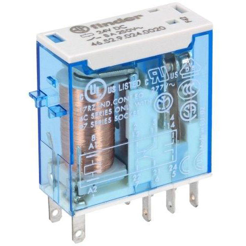 • Миниатюрное промышленное электромеханическое реле монтаж в розетку или наконечники Faston 2,5х0,5мм 2СO 8A контакты AgNi катушка 24В DC Finder Finder  46.52.9.024.0020