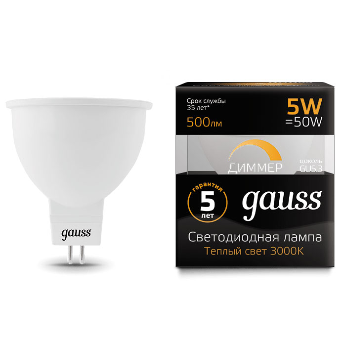• Лампа светодиодная MR16 GU5,3 175-265В 5Вт 2700К диммируемая Gauss