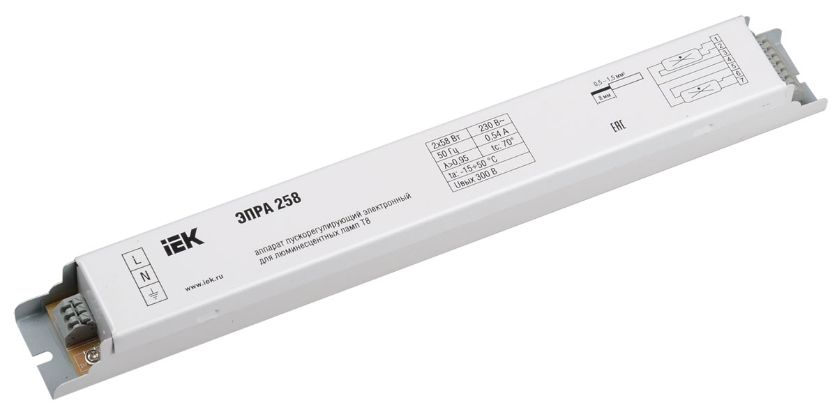 • ЭПРА 258 для линейных ЛЛ Т8, 2х58W, 280x30x25мм, IP20 IEK