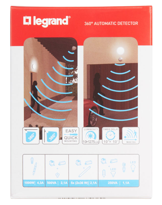 При наличии Датчик движения настенно-потолочный ИК 360С, 8м, 45м2, IP55 / белый Legrand на складе и оформлении заказа до 16:00 - доставка или самовывоз через один рабочий день.
