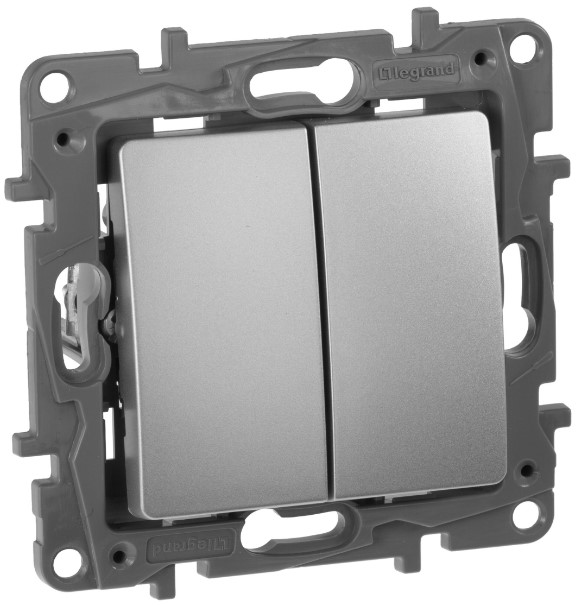 При наличии Выключатель двухклавишный автоматические клеммы 10 AX 250 В~ Legrand Etika Алюминий на складе и оформлении заказа до 16:00 - доставка или самовывоз через один рабочий день.