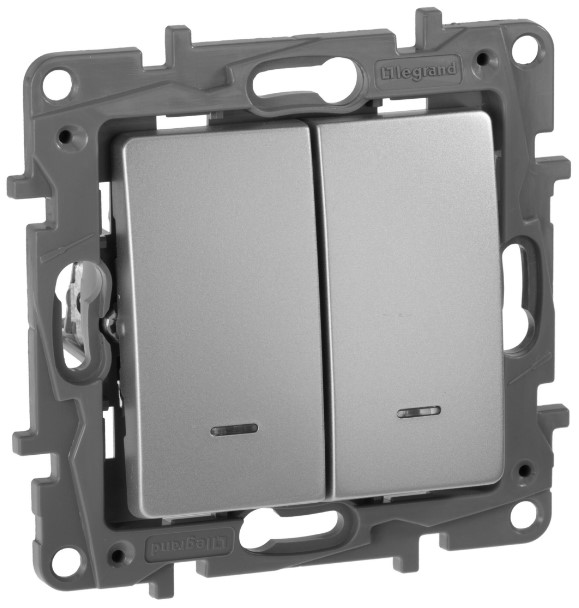 При наличии Выключатель двухклавишный с подсветкой/индикацией автоматические клеммы 10 AX 250 В~ Legrand Etika Алюминий на складе и оформлении заказа до 16:00 - доставка или самовывоз через один рабочий день.