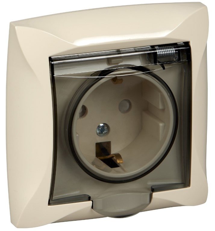 • Розетка с заземлением с защитными шторками с крышкой в сборе с рамкой IP44 SE Дуэт Бежевый