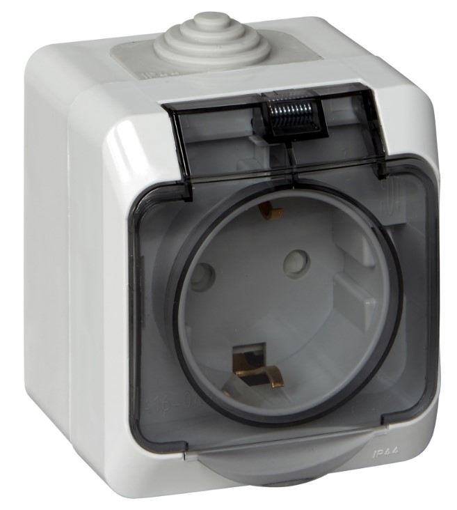 • Розетка 1-ая с заземлением с защитными шторками с крышкой накладного монтажа IP44 SE Этюд Серый