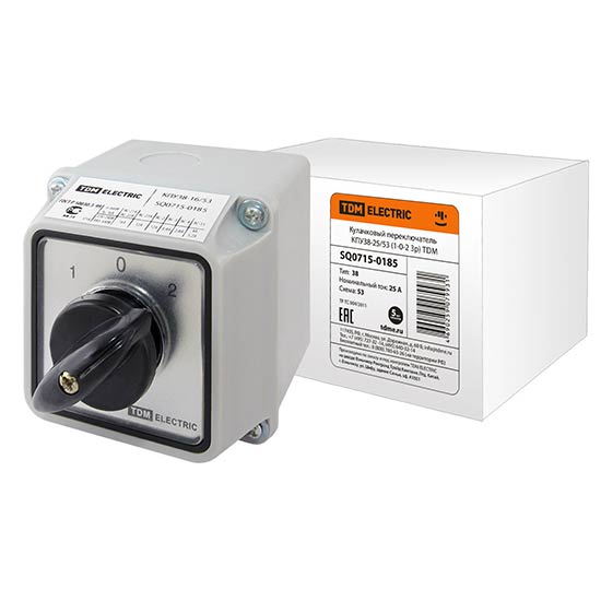 • Переключатель кулачковый (1-0-2 / с перемычкой) в боксе 3P, 25A, 230/400V, IP54 / белый/черный TDM КПУ38-25/53