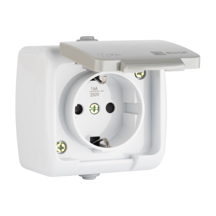 • Розетка 1-местная 16A с заземлением с крышкой IP54 серый с защитными шторками EKF Мурманск