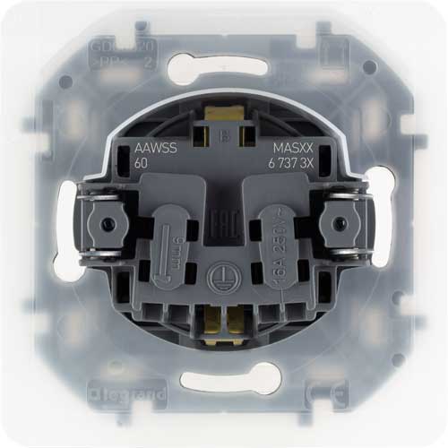 • Розетка с заземлением, защитной крышкой и интегрированными защитными шторками для скрытого монтажа, IP44 16 А, напряжение ~250В, 3680 Вт. Legrand Inspiria Алюминий