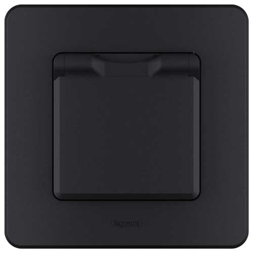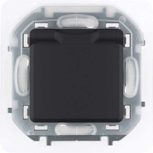 • Розетка с заземлением, защитной крышкой и интегрированными защитными шторками для скрытого монтажа, IP44 16 А, напряжение ~250В, 3680 Вт. Legrand Inspiria Антрацит