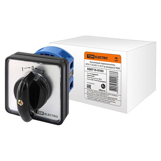 • Переключатель кулачковый (1-0-2 / самовозврат, с перемычкой) 1P, 25A, 230/400V, IP40/IP20 / белый/черный TDM КПУ11-25/201