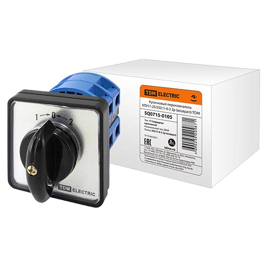 • Переключатель кулачковый (1-0-2 / самовозврат, с перемычкой) 2P, 25A, 230/400V, IP40/IP20 / белый/черный TDM КПУ11-25/202