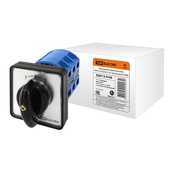 • Переключатель кулачковый (1-0-2 / самовозврат, с перемычкой) 3P, 25A, 230/400V, IP40/IP20 / белый/черный TDM КПУ11-25/203