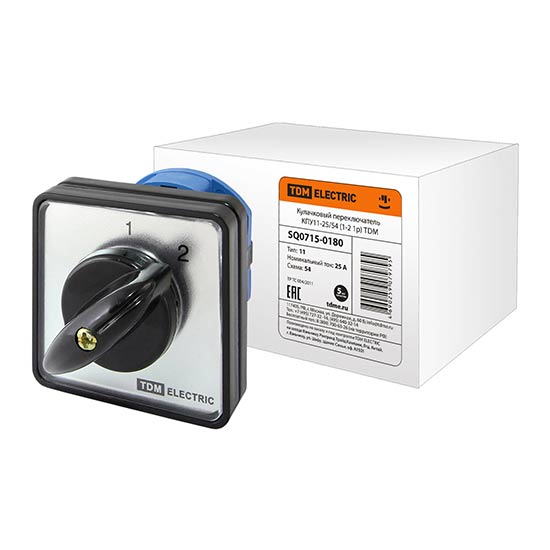 • Переключатель кулачковый (1-2 / с перемычкой) 1P, 25A, 230/400V, IP40/IP20 / белый/черный TDM КПУ11-25/54