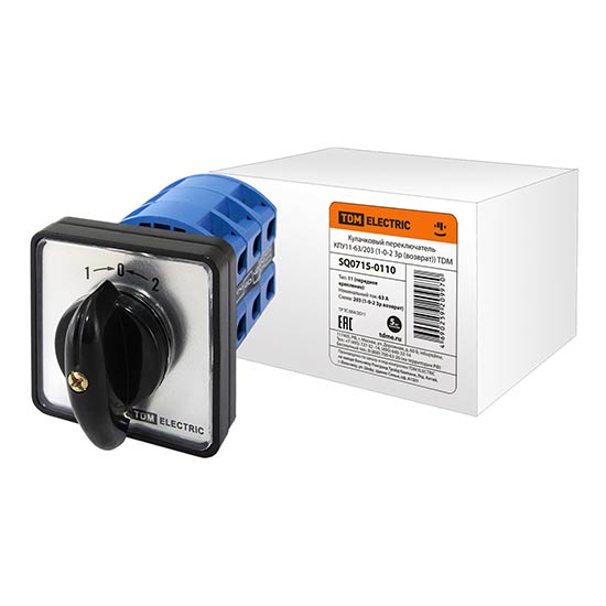 • Переключатель кулачковый (1-0-2 / самовозврат, с перемычкой) 3P, 63A, 230/400V, IP40/IP20 / белый/черный TDM КПУ11-63/203