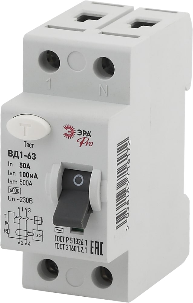 • Устройство защитного отключения 1P+N 50A тип AC 100mA Эра Pro ВД1-63